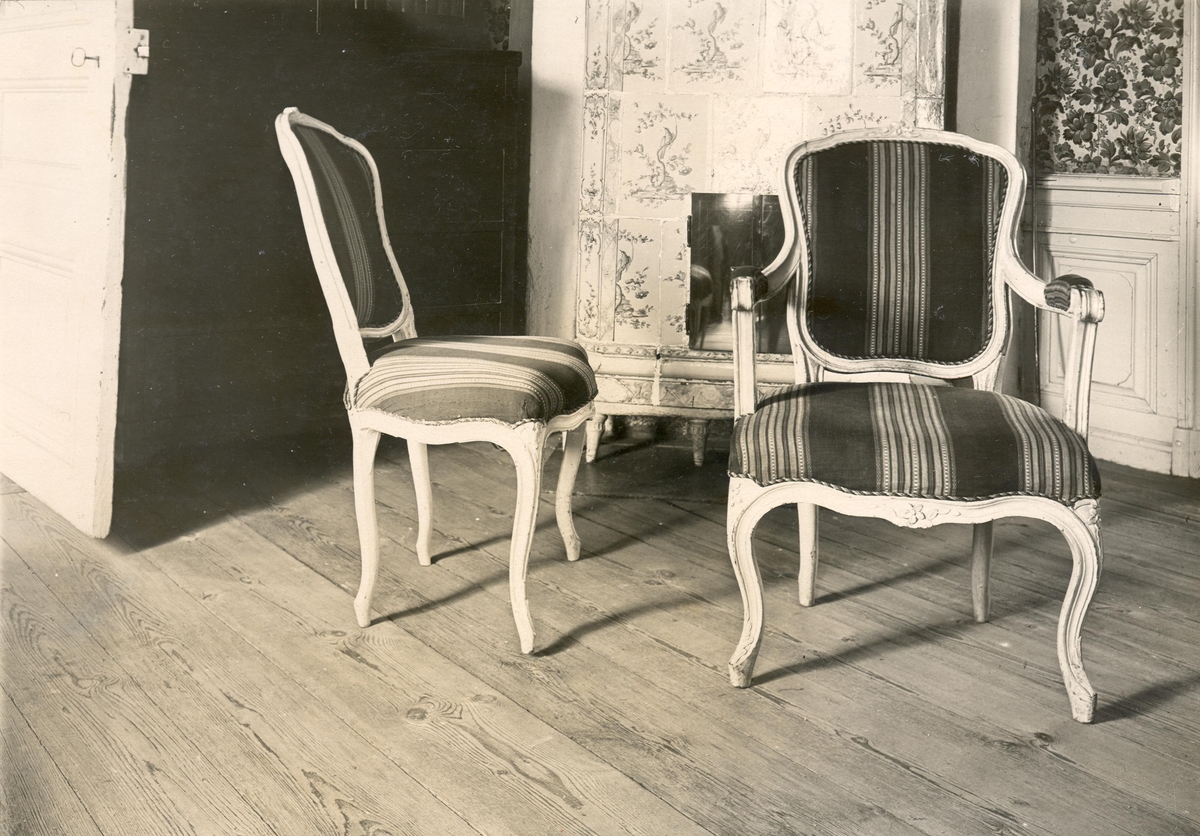 Interiörsbild i en mangårdsbyggnad i Strömsund. Två vita rokokostolar, stående på nedre våningen.