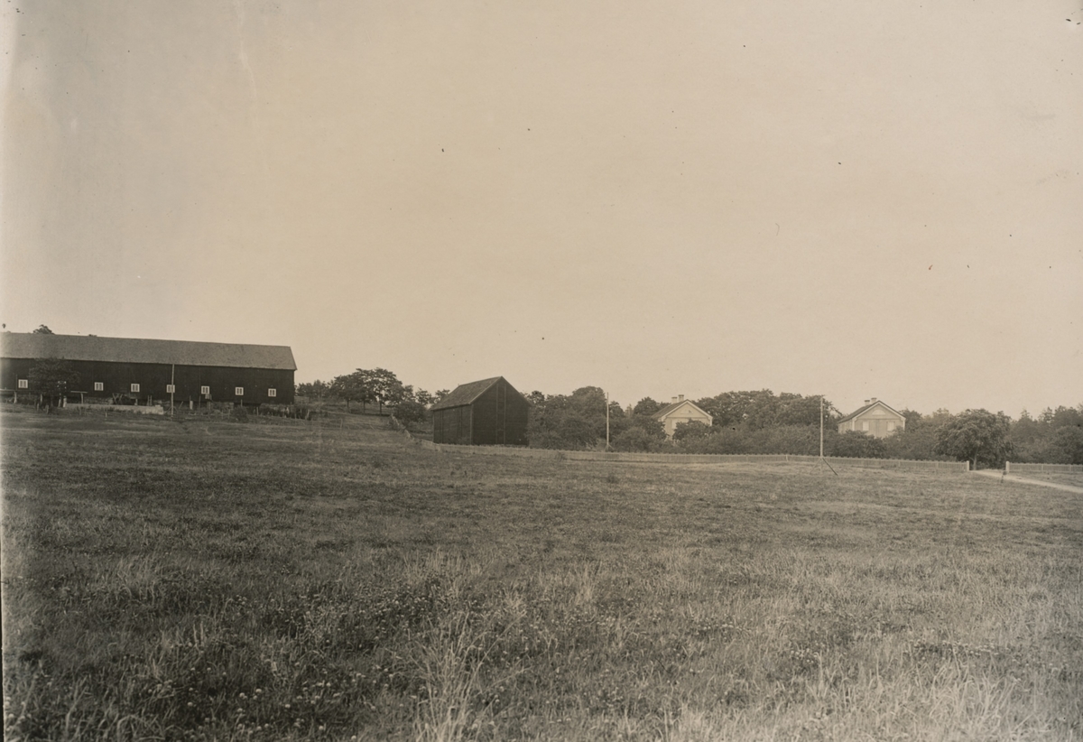 En gård i Kallsåker, sedd från landsvägen. Från vänster ladugårdslängan, magasin, och två mangårdsbyggnader.