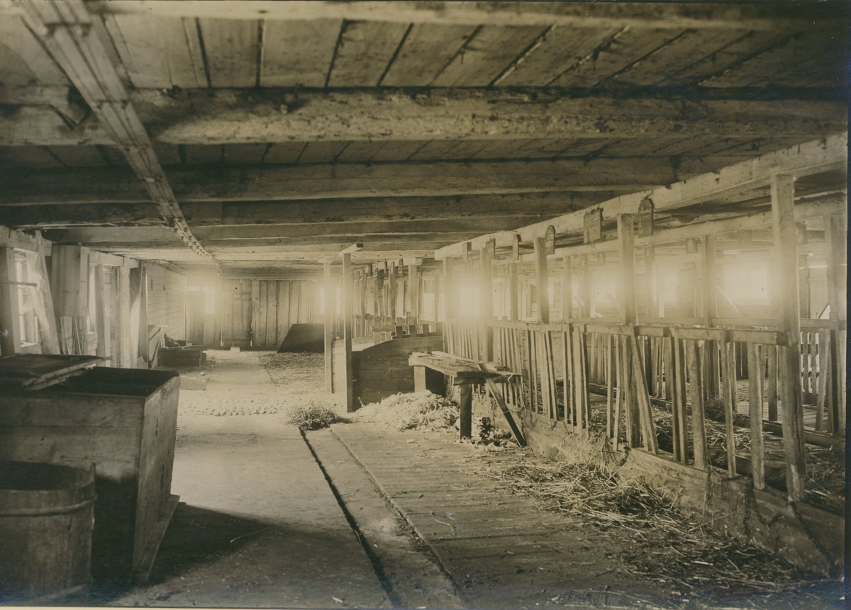 Ladugården: Fodergivare i mitten med plats för kreatur på båda sidor. Avbalkningar för småkräk vid ytterväggen till höger.