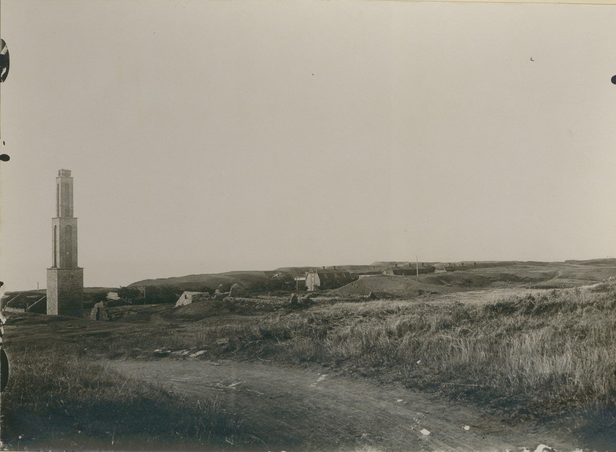 Bruksruinerna uppifrån gårdsplanen i Degerhamn. Mellan de långa skiffteraskhögarna syns taken på arbetarbostäderna.