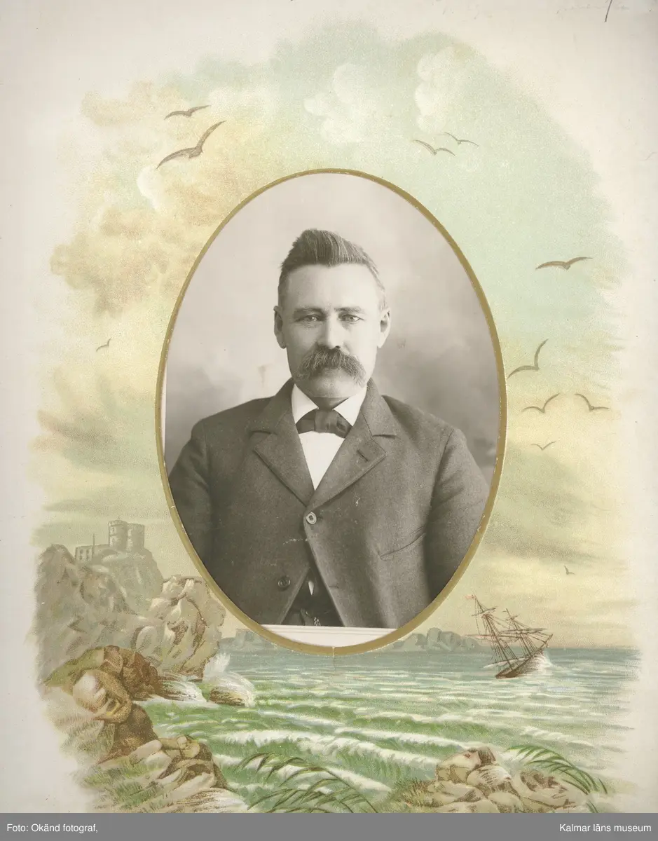 En man i kostym och kravatt. Runt omkring porträttet är ett målat landskap.