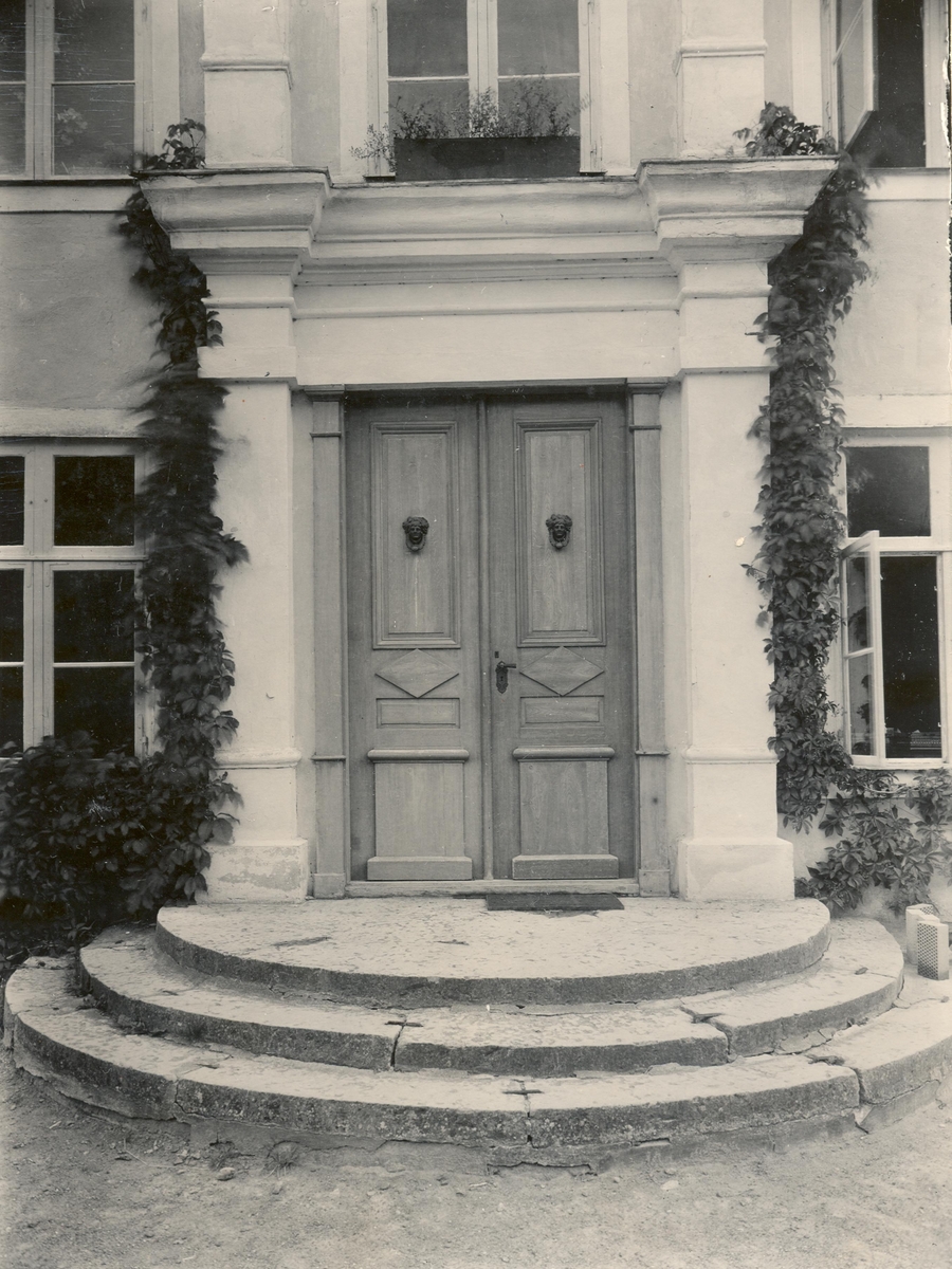 Råsnäs herrgård, huvudportalen på stora byggningen. Portklappar av järn, empir. Liknande på Kläckeberga.