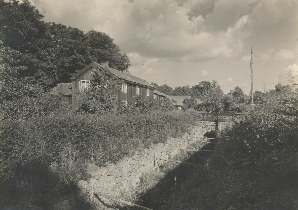 Arbetarbostäder på Bruatorp nedanför kvarnen, hörande till det forna tegelbruket, färgeriet etcetera. Längst ned garveribyggnaden. I mitten kanal med bro.