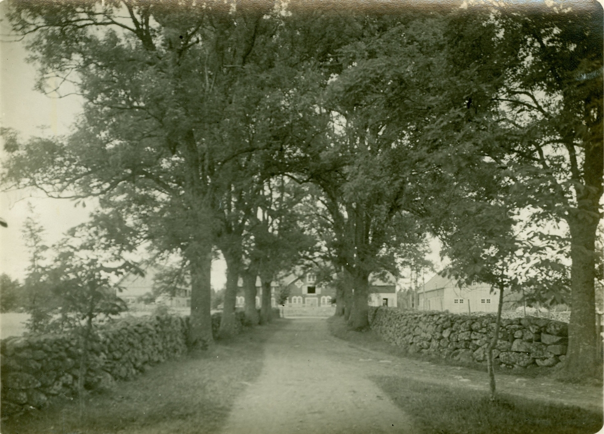 Uppfarten till Maltebo gård, allé med askar. Å sidorna stenmurar. I fonden en ladugård.