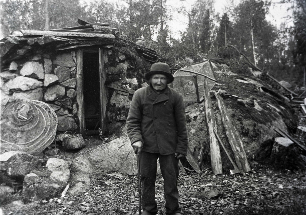 Nisse Päll framför sin koja vid sjön Sinnern.