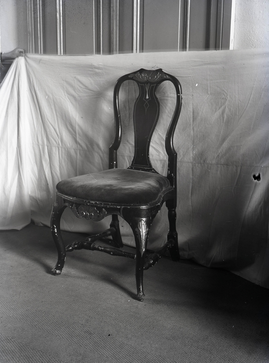 Gladhammar kyrka: Stol i sakristian, med Stockholms stolmakareämbetets pappersstämpel och sign OH (OHL?) samt året 1765.