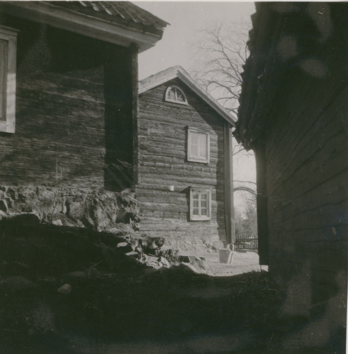 Ett bostadshus mellan två byggnader i Hagnebo.