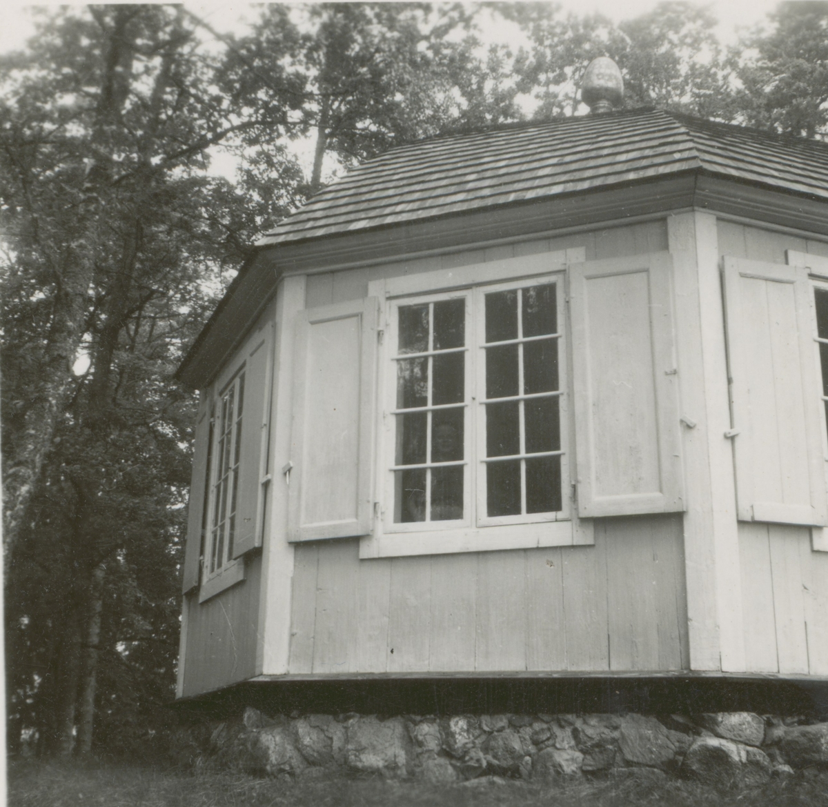 Djurgårdskullen. Utsikt mot sjön och Odensvi kyrka. Lusthuset på kullens topp.
