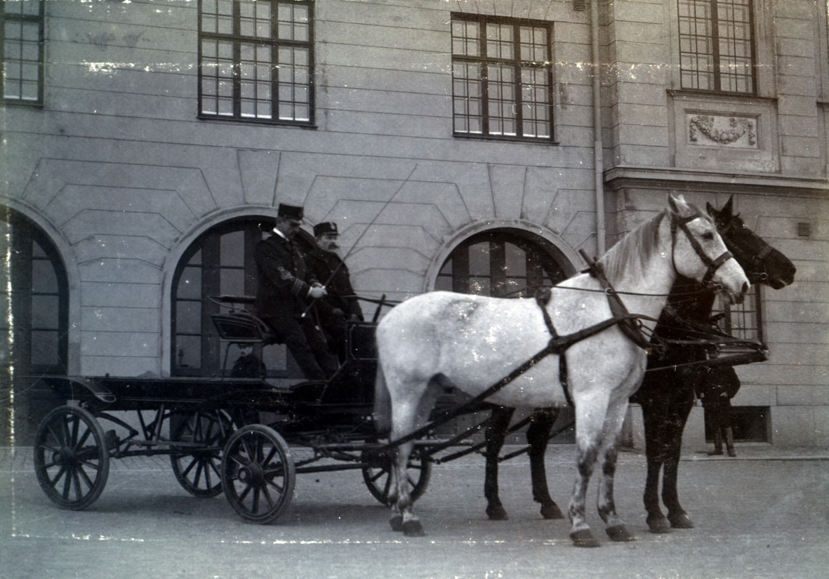 Två av brandstationens hästar spända framför motionsvagnen, utanför brandstationen.