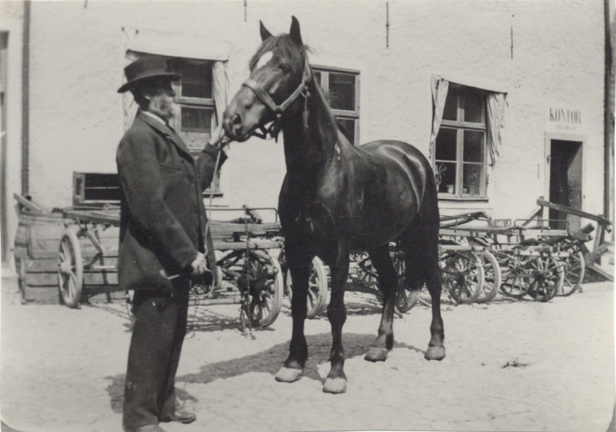 Bryggeriet Nordstjernan. Fodermästare Nilsson på gården med bryggarhäst och vagnar.