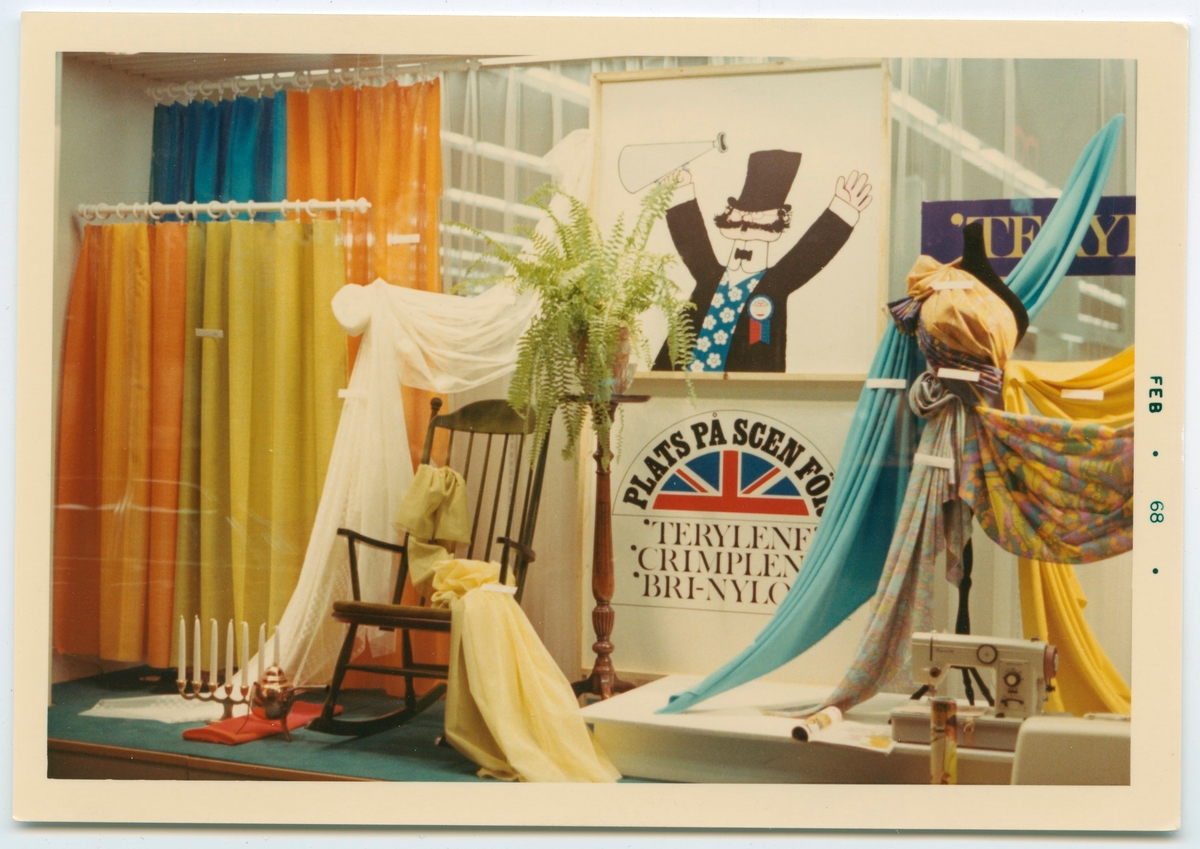 Skyltning med terylentyger i Domus skyltfönster, i Kalmar, 1968.