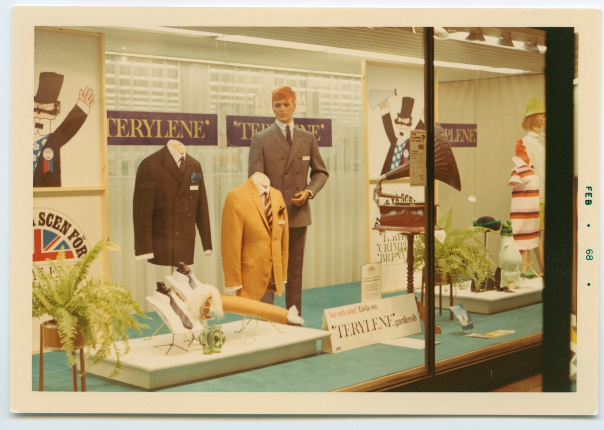 Skyltning med herrkläder av terylen, i Domus fönster i Kalmar, 1968.