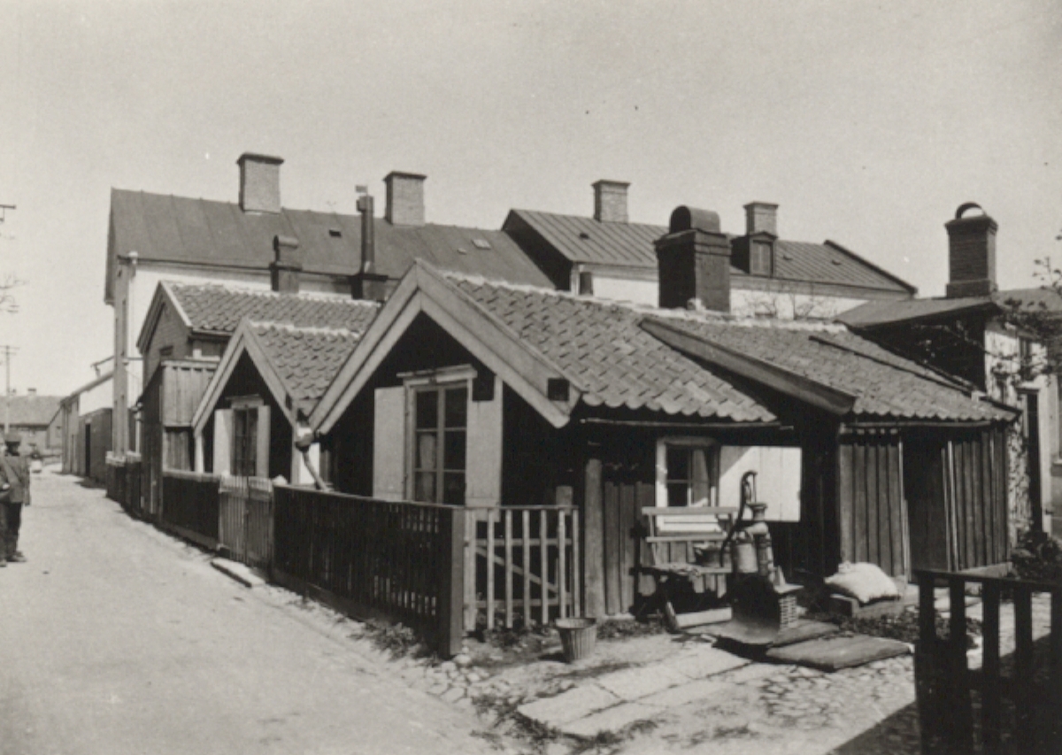 Små bostadshus med fönsterluckor och träfasader på Västerlånggatan i Gamla staden år 1908.