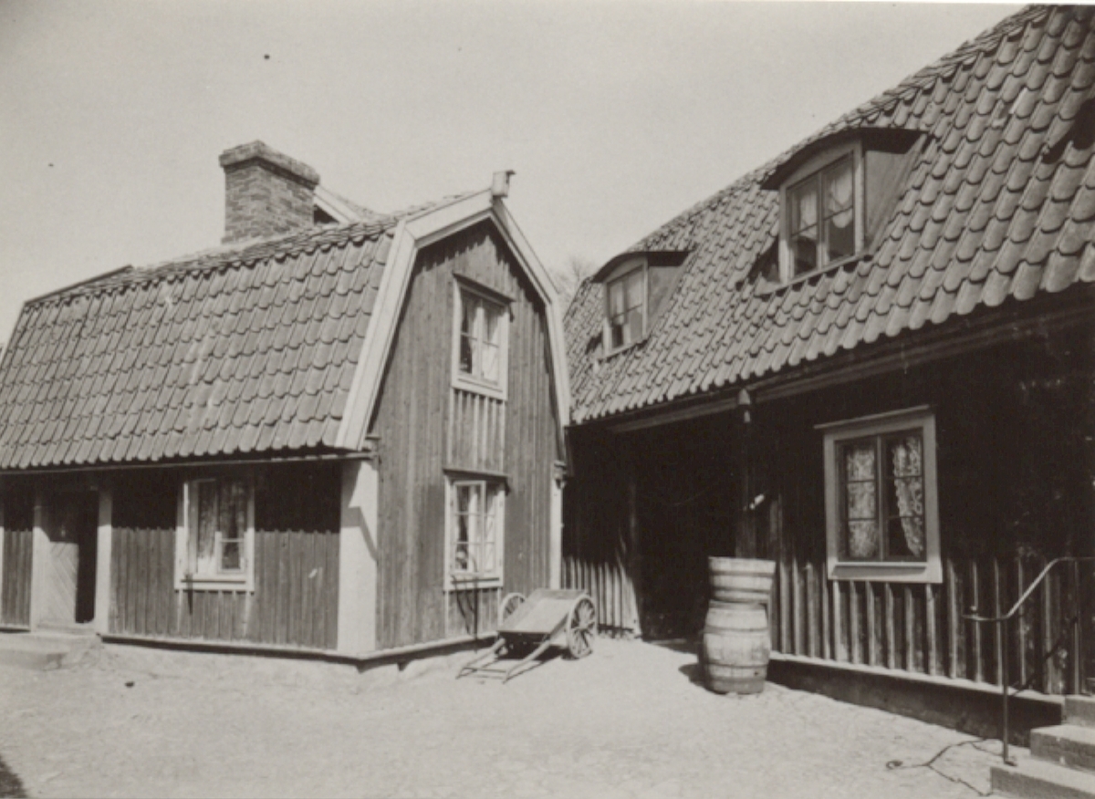 Bostadshus med mansardtak varav den ena har takkupor. Kvarteret Alen 14 i Gamla staden. Västerlånggatan 7, från Molinsgatan. Året är 1908.