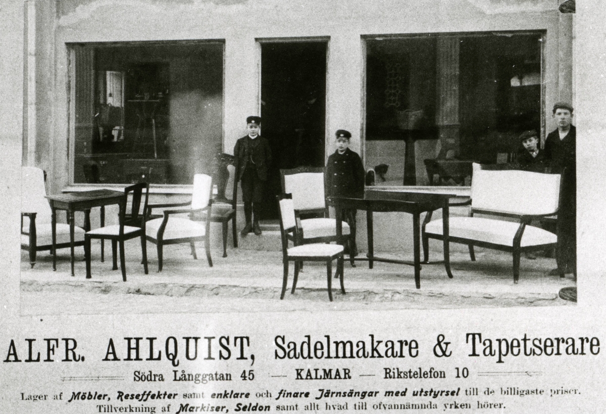 Alfr. Ahlquist, Sadelmakare & Tapetserare, Södra Långgatan 45. Detalj av annonstavla 1908.