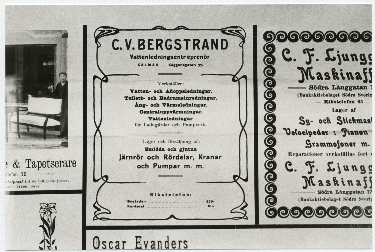 C. V. Bergstrand, Vattenledningsentrepenör, Kaggensgatan 37. Detalj av annonstavla, daterad 1908.