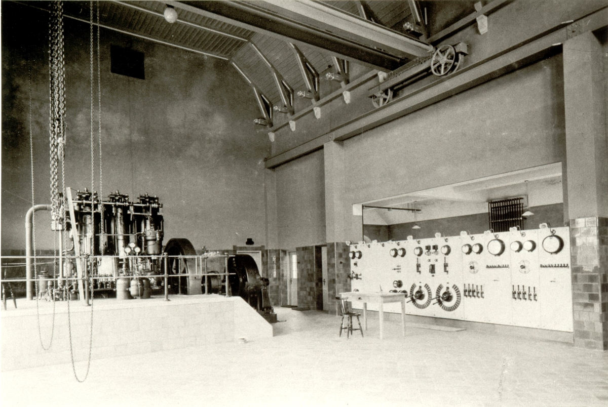 Interiören av elverket i Kalmar. Generator, instrumentpanel och bord med stol.