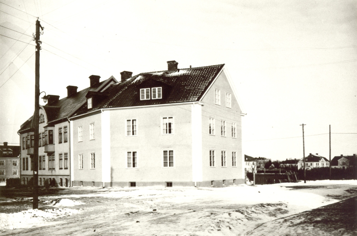 Bostadshus i kvarteret Hackspetten 6, hörnet Tegnérgatan - Ryttaregatan 7 under vintertid. Huset i mitten har takkupor, byggnaden till vänster har burspråkar.