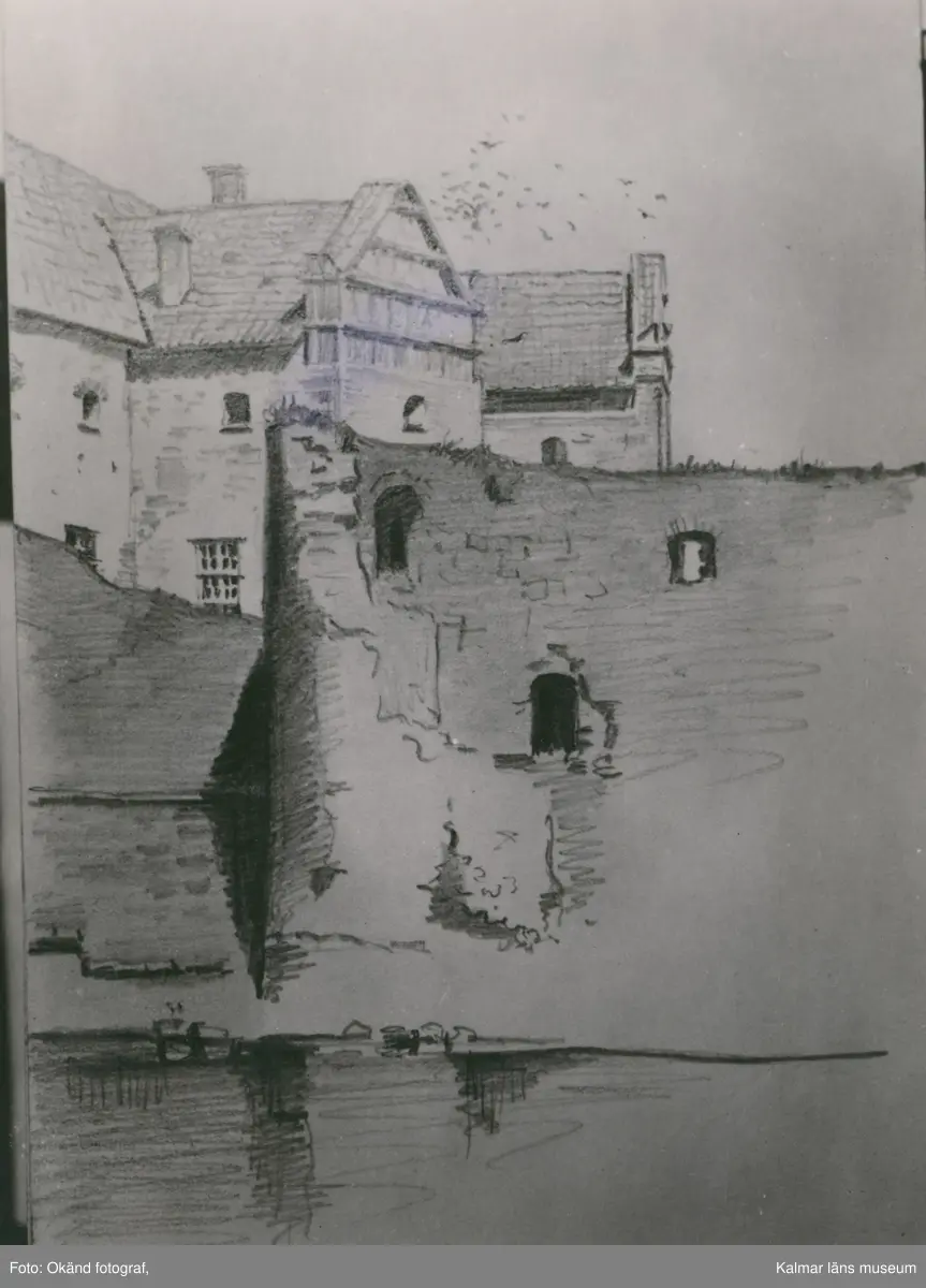 Teckning av Nils Kreuger 1878. Södra postejen och nordöstra tornet. Skissbok i Kalmar konstmuseum.