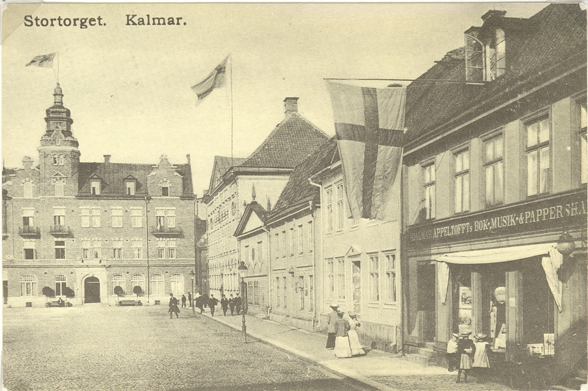 Stortorget i Kalmar med bland annat stadshotellet, rådhuset och Appeltoffts bokhandel.