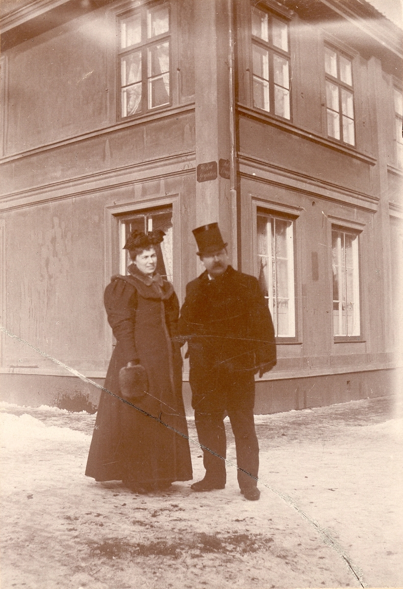 En man i en cylinderhatt och en kvinna står vid hörnet av Västra Sjögatan och Södra Långgatan.