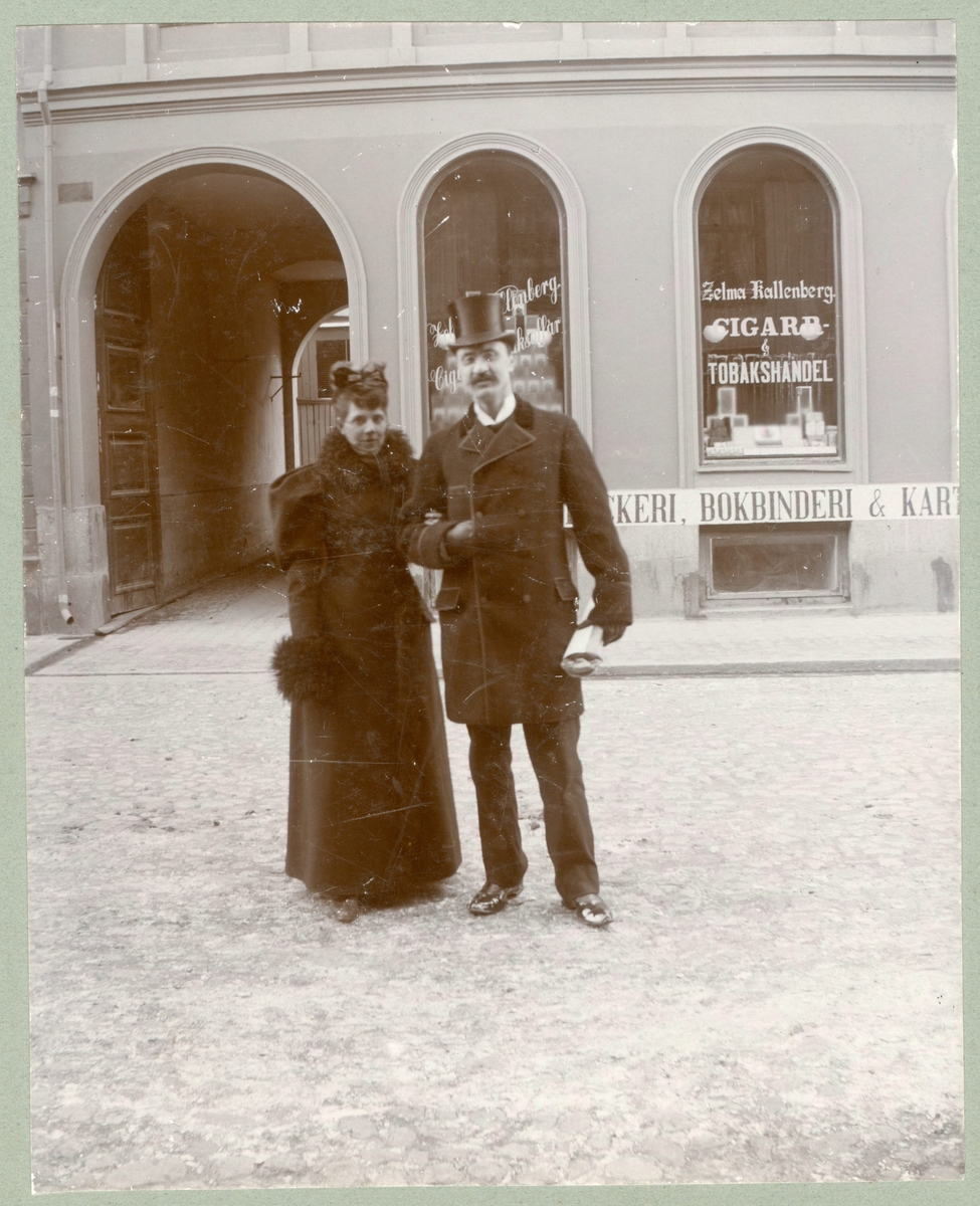 En man och en kvinna framför en butiksbyggnad. Text på skyltfönstret: "Zelma Hallenberg cigarr & tobakshandel".