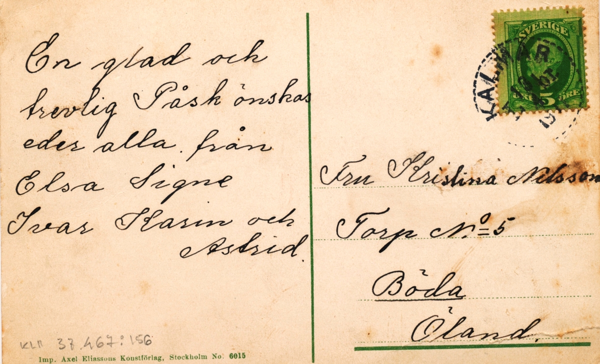 Ett påskkort till fru Kristina Nilsson, Torp no 5, Böda, Öland. "En glad och trevlig Påsk önskas eder alla från Elsa, Signe, Ivar, Karin och Astrid."