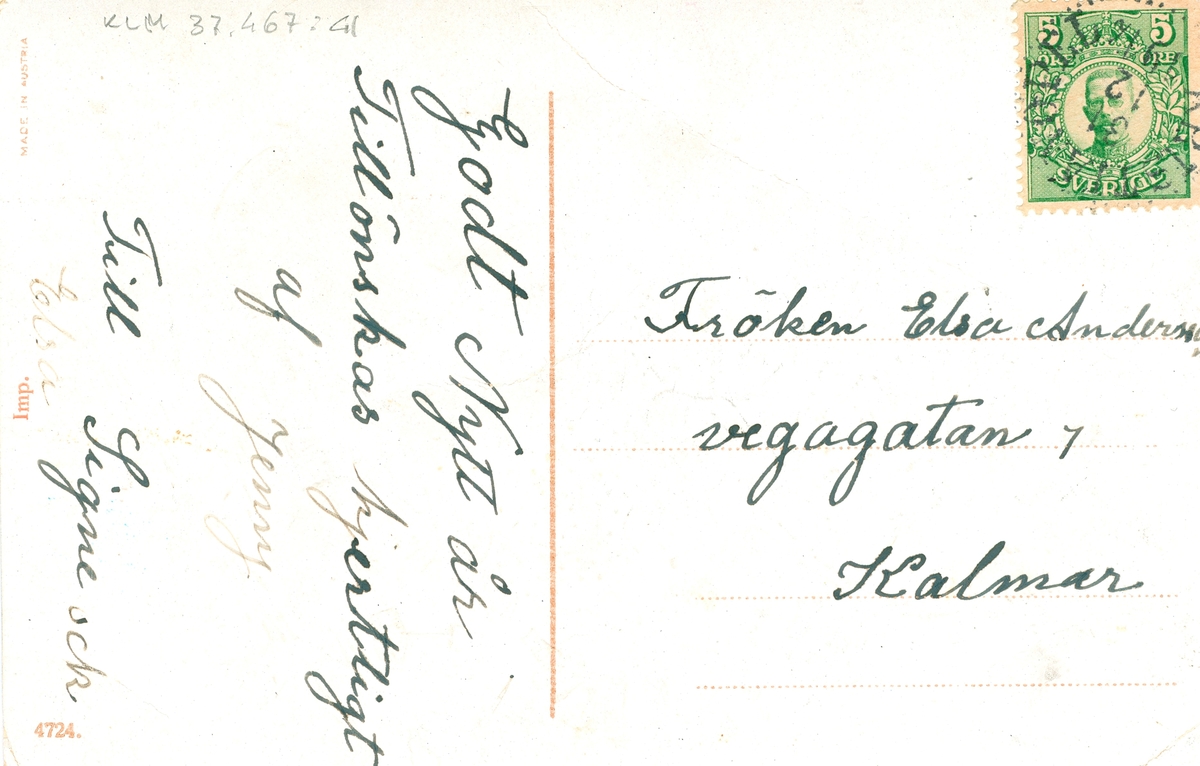 Text till kort: "Godt Nytt år Tillönskas hjertligt af Jenny. Till Signe och Elsa."