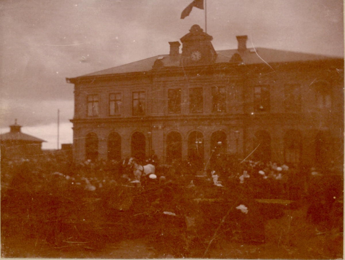 En folkmassa och hästar vid Centralstationen i Kalmar.