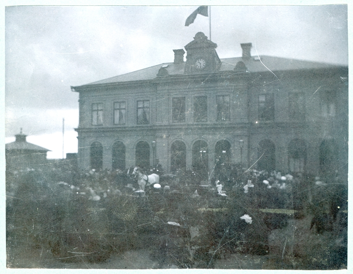 En folkmassa och hästar vid Centralstationen i Kalmar.