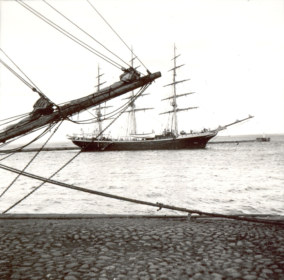Ett bogsprö och det danska skolskeppet Georg Stage.