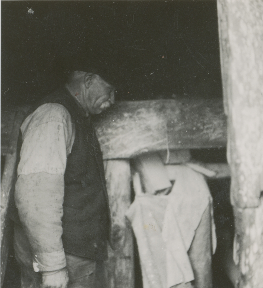 En man i en kvarn i Kvarnstad, vänster om stora landsvägen. Mjölnaren för tillfället borta. Mälden övervakades av en närboende smed.