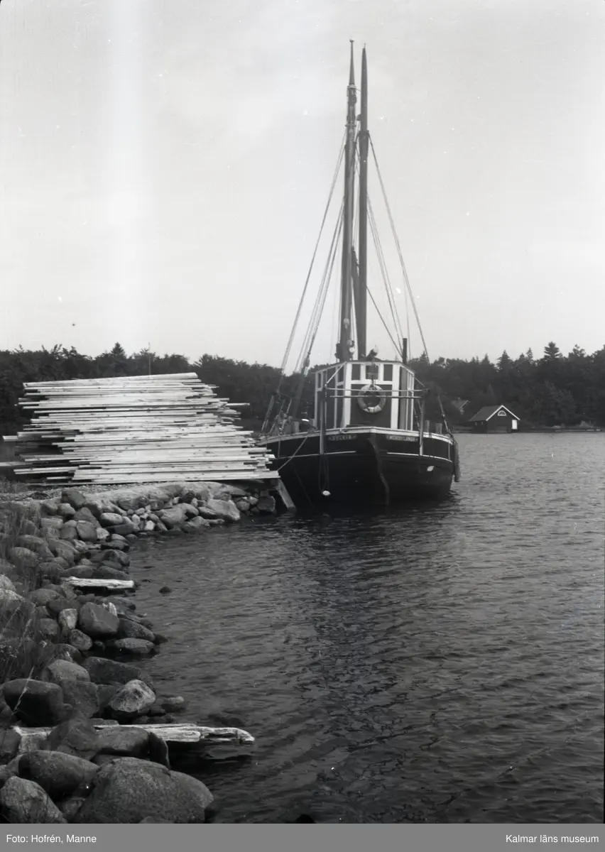En båt i hamnen till Värnanäs. Virke ligger bredvid båten.