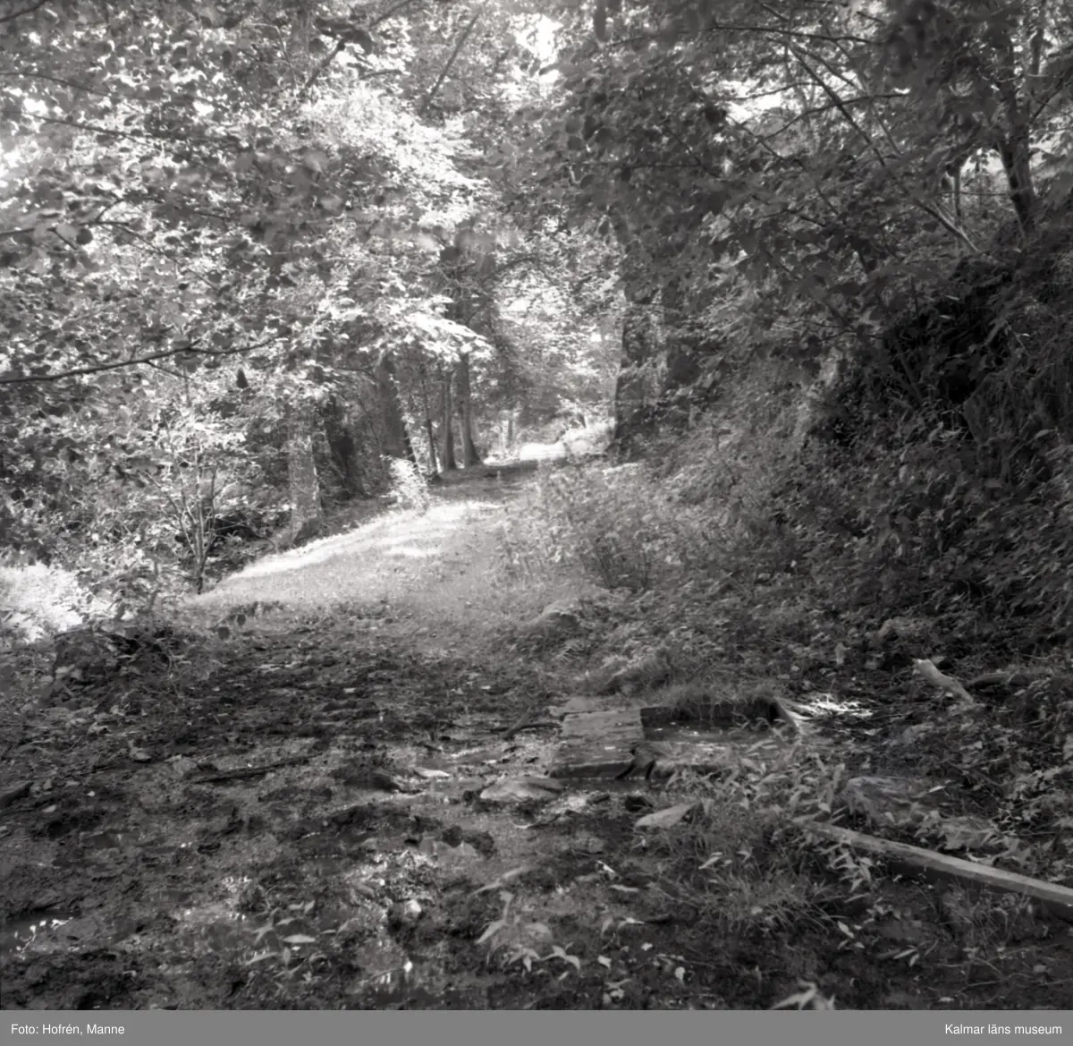 En gångstig och resterna av Norrby brunn, hälsobrunn som har haft en överbyggnad.