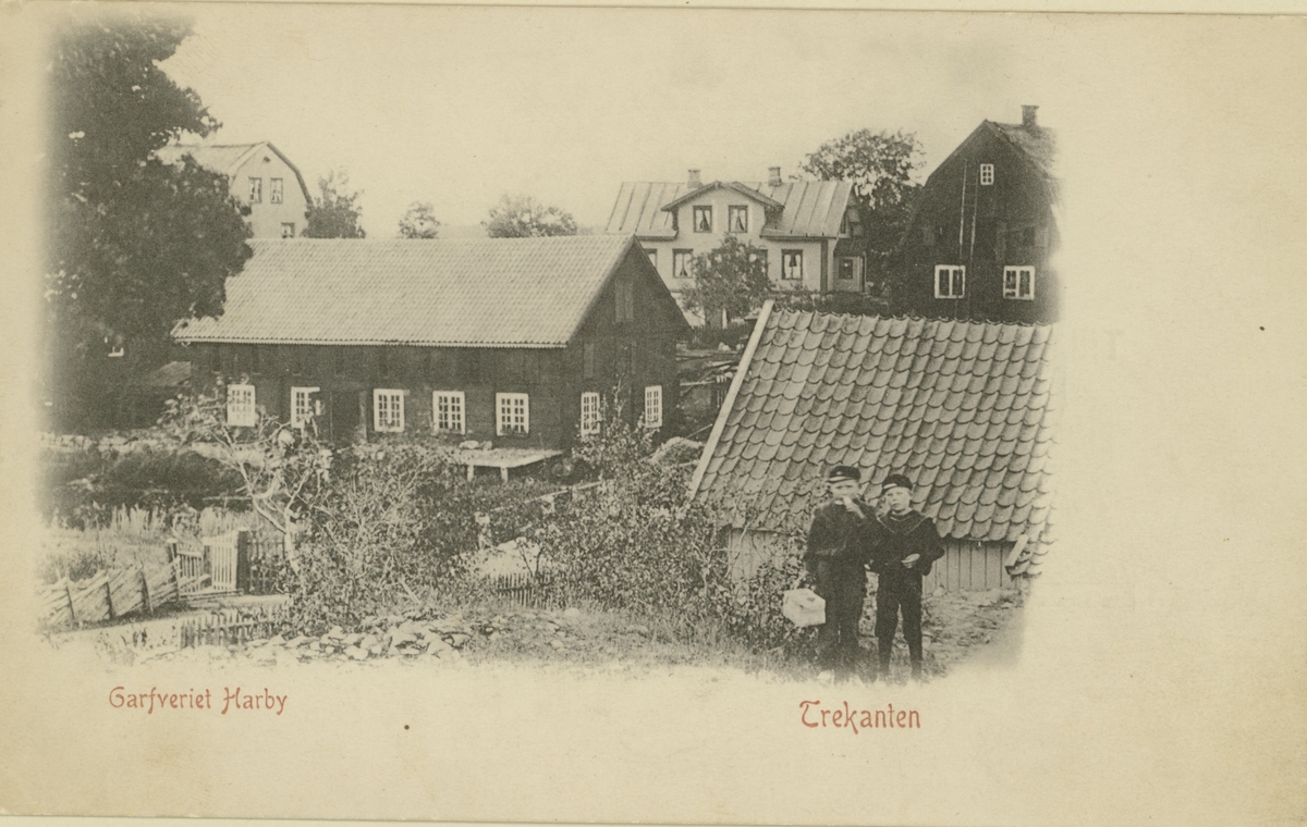 Ett vykort på garveriet Harby i Trekanten. Två barn står till höger.