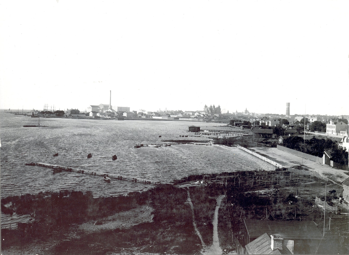 Bild på Kvarnholmen i bakgrunden där man ser bland annat domkyrkan och det gamla vattentornet. Till vänster i bild har vi Ängö.