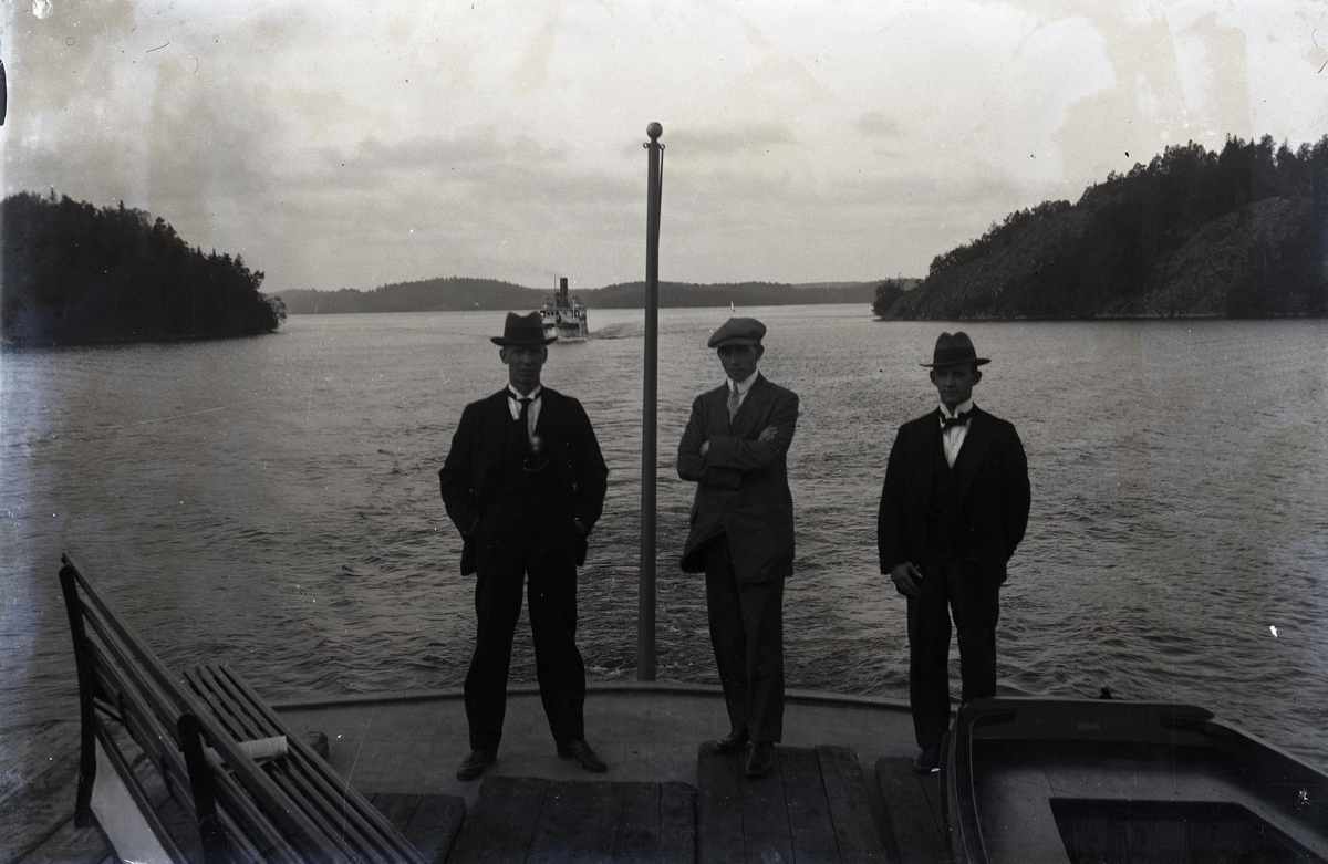 Tre män som står på akterdelen av en båt som åker i en skärgård.