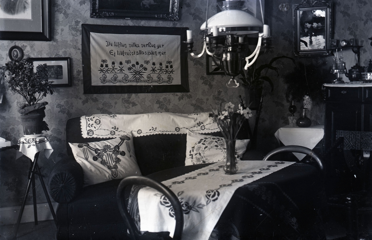 Kuddar i soffa, duk på bord och en bonad "De löften vilka verlden ger Ej tillfredställa själen mer.". Blommor, tavlor med mera i ett bostadsrum.