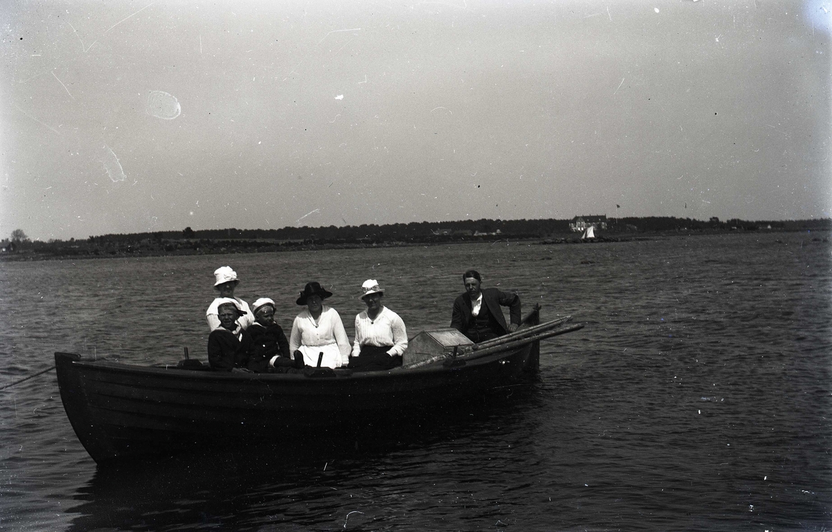 En man, tre kvinnor och två barn på en båtutflykt.
