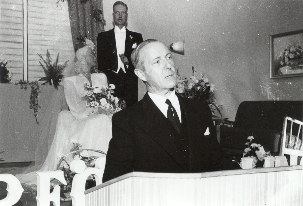 Borgmästare Yngve Malmqvist med en skyltdocka i bakgrunden.