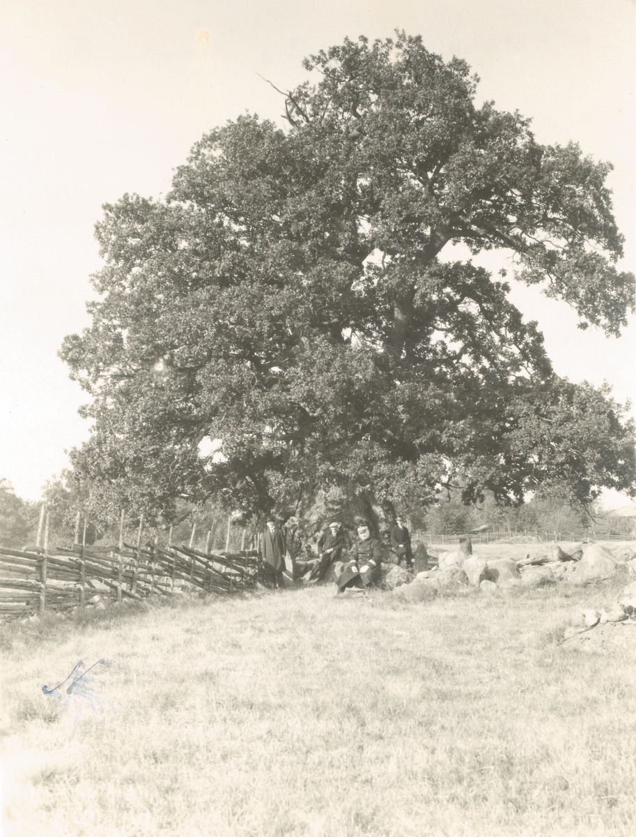 Norra Kvills Kronopark vid den sedermera fridlysta eken. Landshövding Falk mellan landsfiskal Nordbeck till vänster och länsassessor Fagerlund till höger.