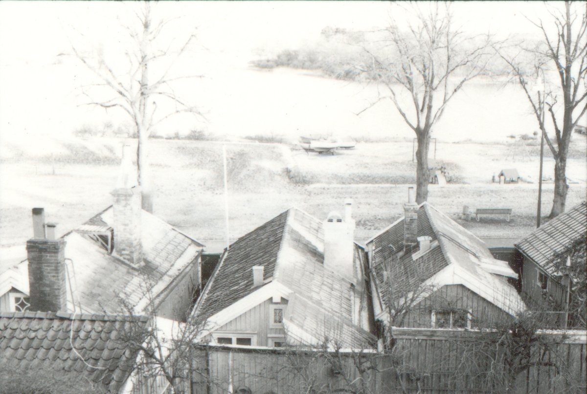 Låga hus med sadeltak på Östra Vallgatan i Kalmar.