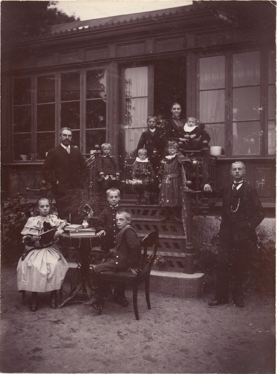 Kort på Läderhandlare Pehr Otto Olsson och hans fru och barn i Lindahls trädgård.