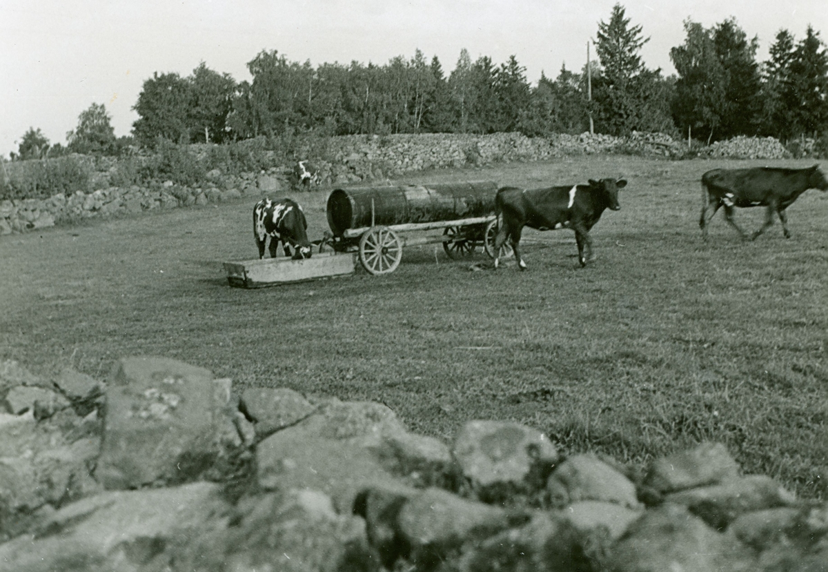 Vattning av korna. Observera att man har kört ut en tunna vatten från ladugården.