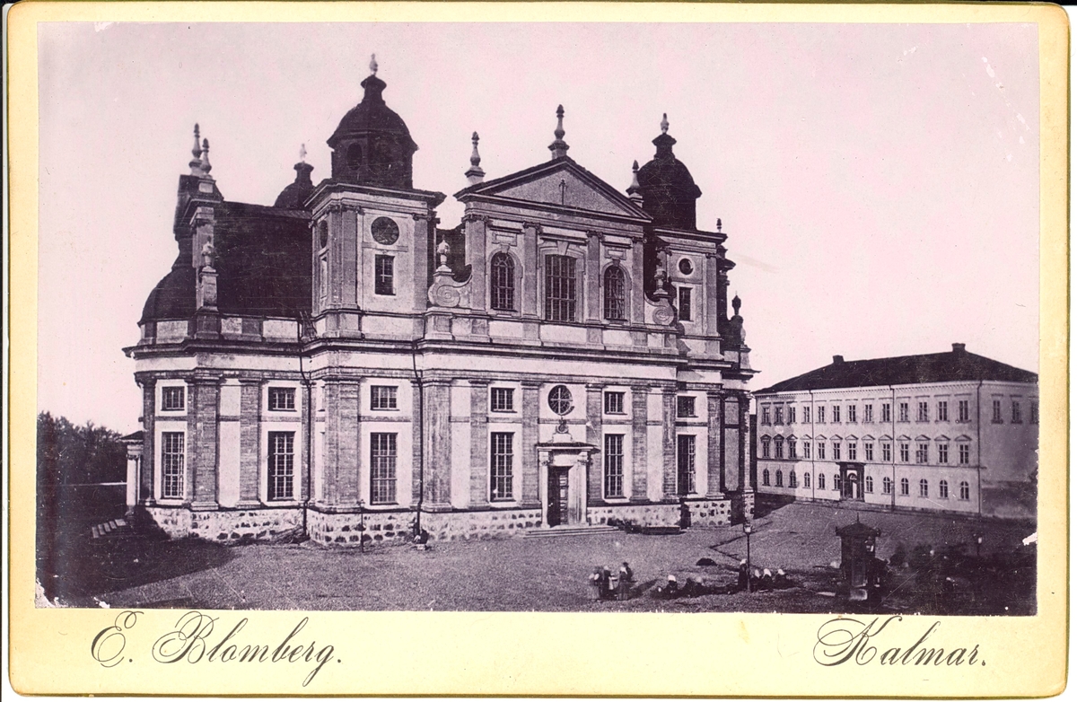 Kalmar Domkyrka på Stortorget. Domkyrkan, i förgrunden syns den kommunala brunnen. Byggnaden till höger är det gamla läroverket.