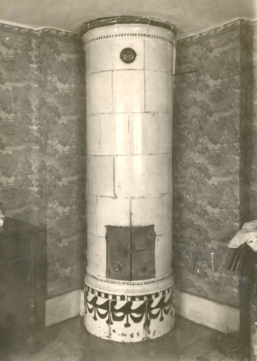 Kakelugn på nedervåningen, kontoret. Mycket mörk manganviolett dekor på gulgrön botten. Sannolikt Mönsteråsfabrikation från 1800-talets mitt.