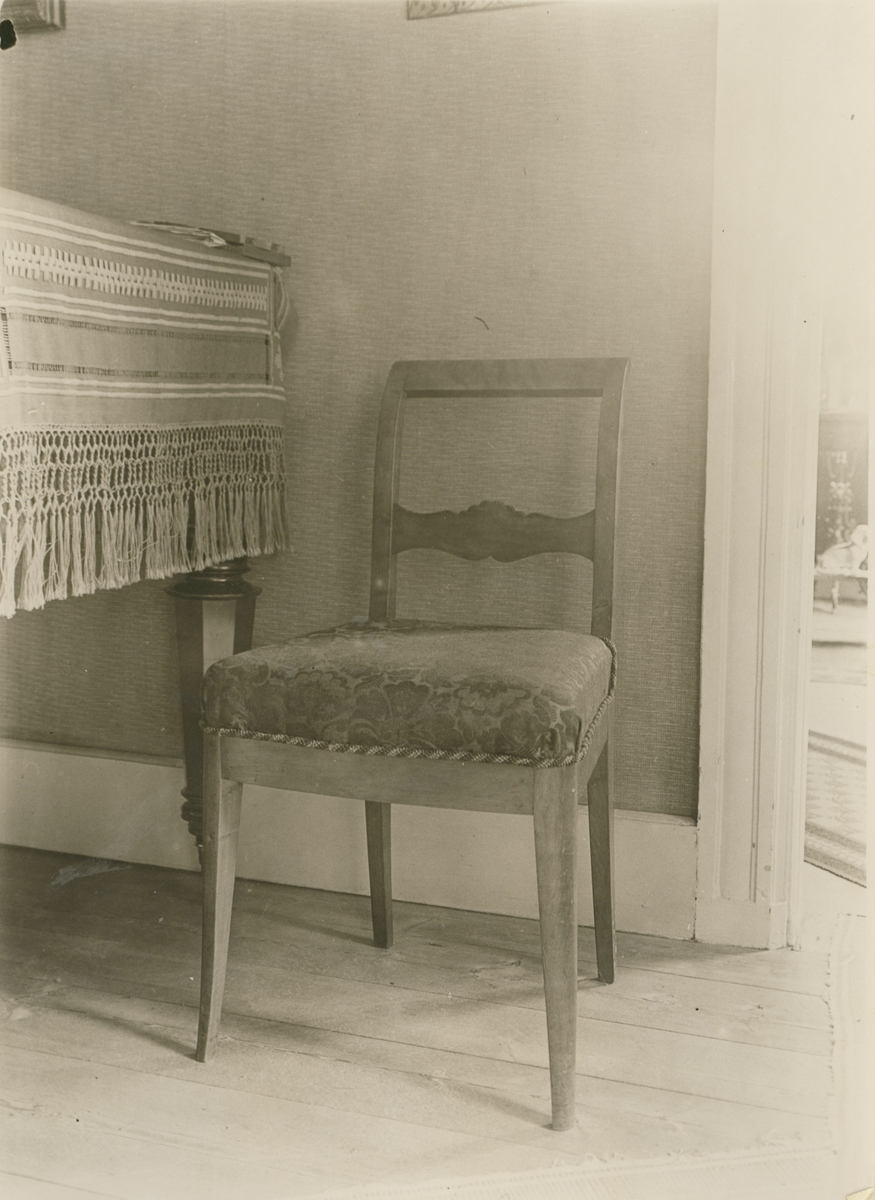 Stol av alm. Flera stycken skall finnas, i förmaket.