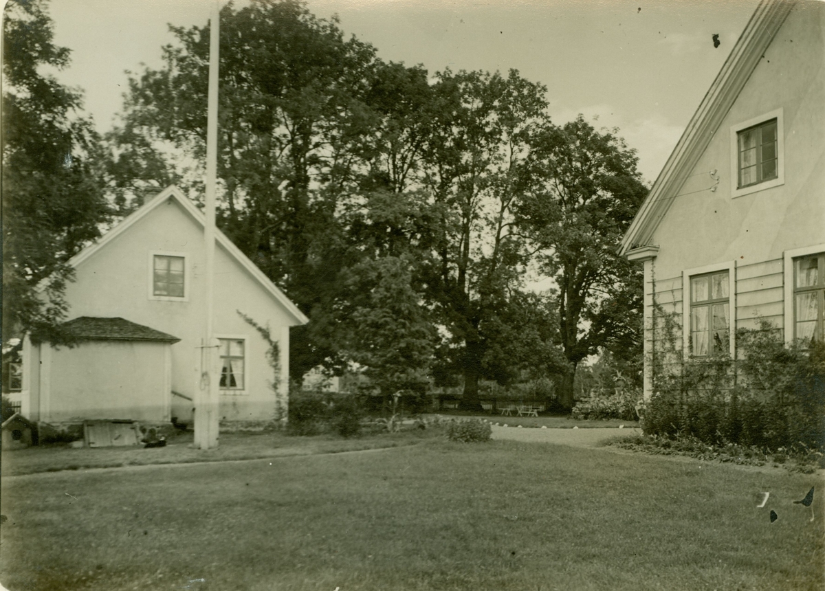 Mangården: västra flygeln samt huvudbyggningen. Byggnaderna gula med hörn och foder i vitt.