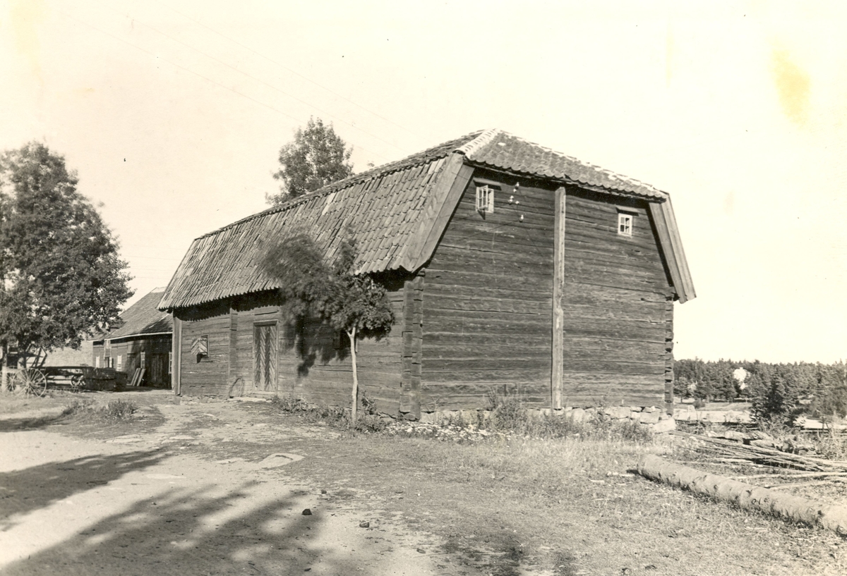Magasinet. Korsknutat timmerhus utan panel under brutet och valmat tak. Rödfärgat.