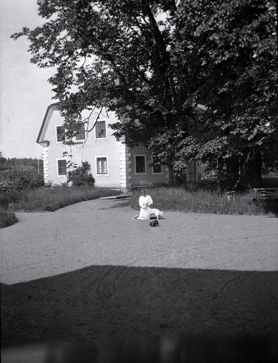 Person med hund framför trädgårdsflygeln på Tuna gård.